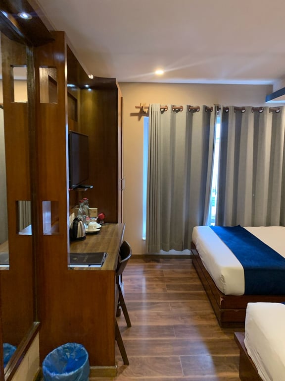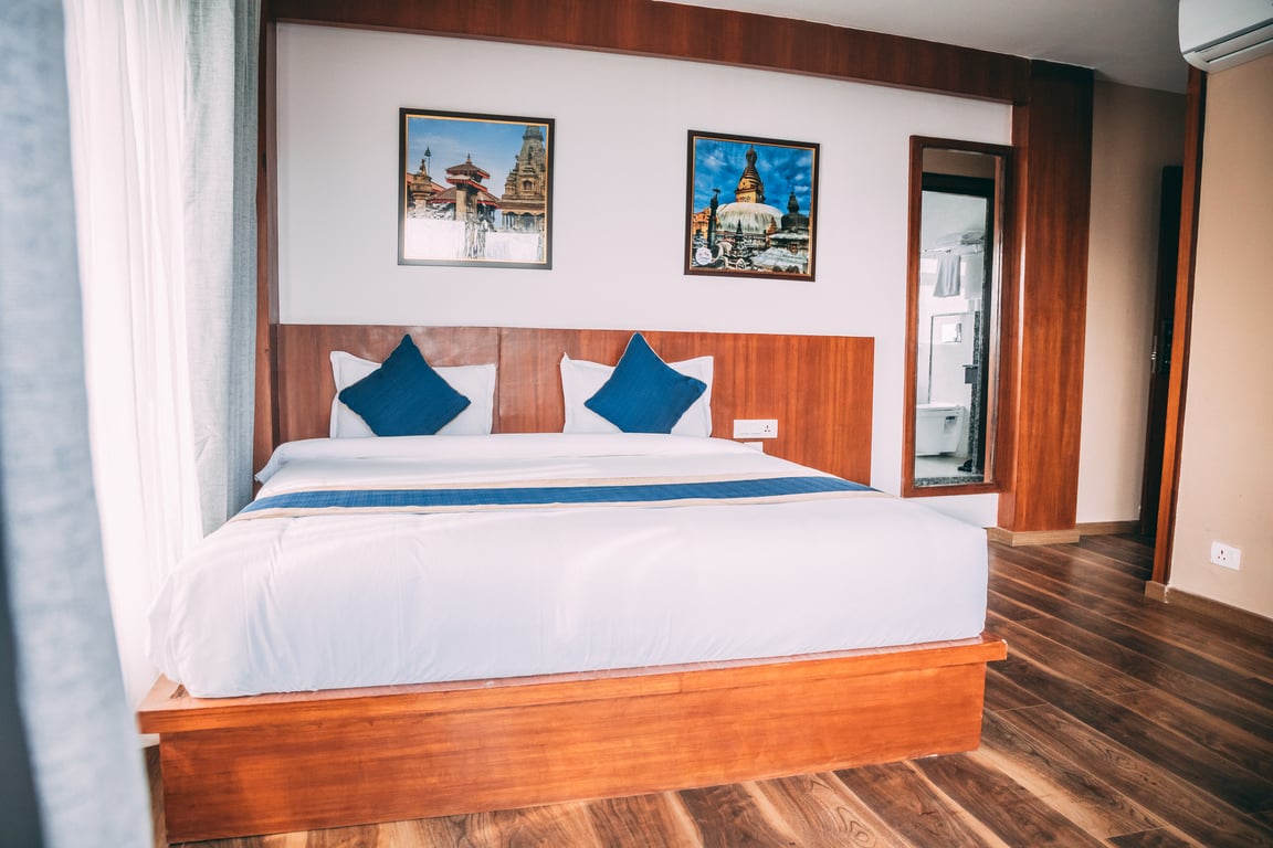 Our flagship suite with hand-carved Nepali furniture and stunning city views.